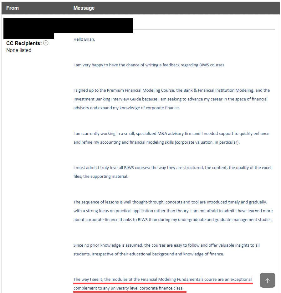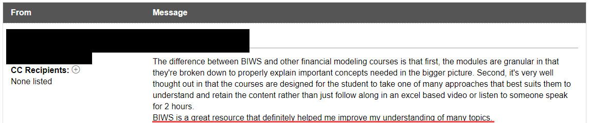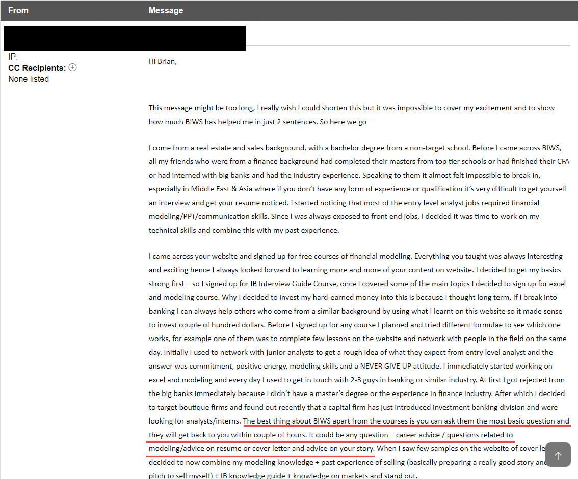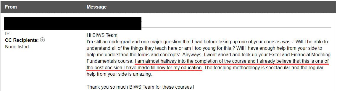 “The best thing about BIWS [that sets it] apart from [other] courses is you can ask them the most basic question and they will get back to you within a couple of hours. It could be any question - career advice / questions related to modeling / advice on [the] resume or cover letter and advice on your story.”