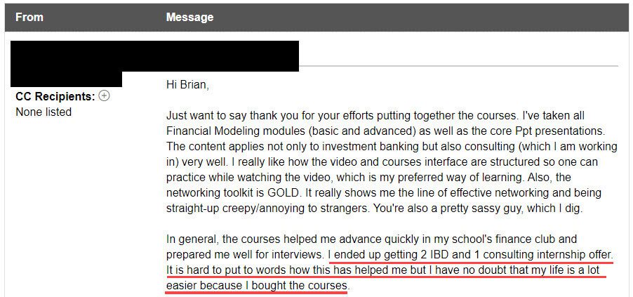 “I ended up getting 2 IBD and 1 consulting internship offer[s]. It is hard to put to words how this has helped me but I have no doubt that my life is a lot easier because I bought the courses.”