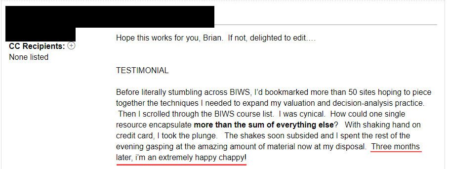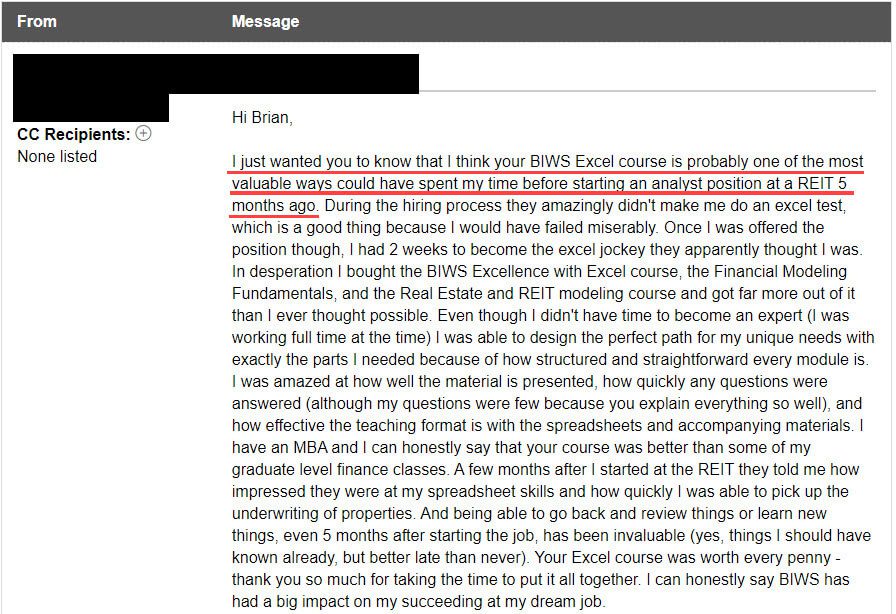 “I just wanted you to know that I think your BIWS Excel course is probably one of the most valuable ways [that I] could have spent my time before starting an analyst position at a REIT 5 months ago.”
