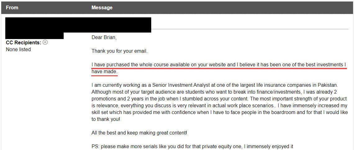“I have learned more about the technicalities of the industry through these lessons than 1. being a finance major at a reputable college, and 2. having an internship with a boutique investment bank.”