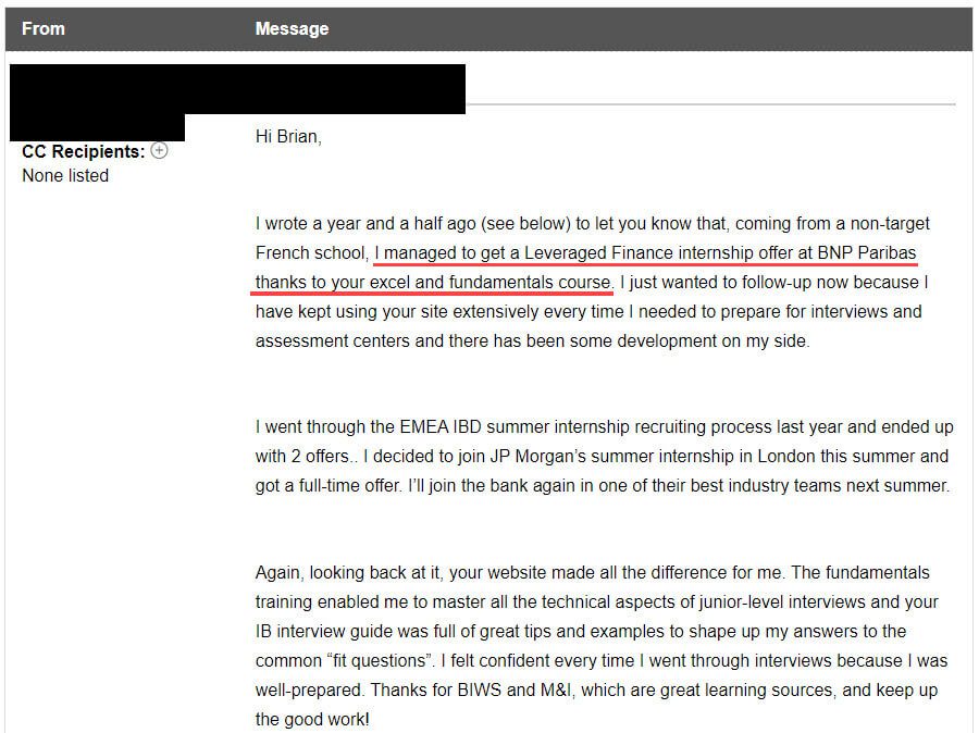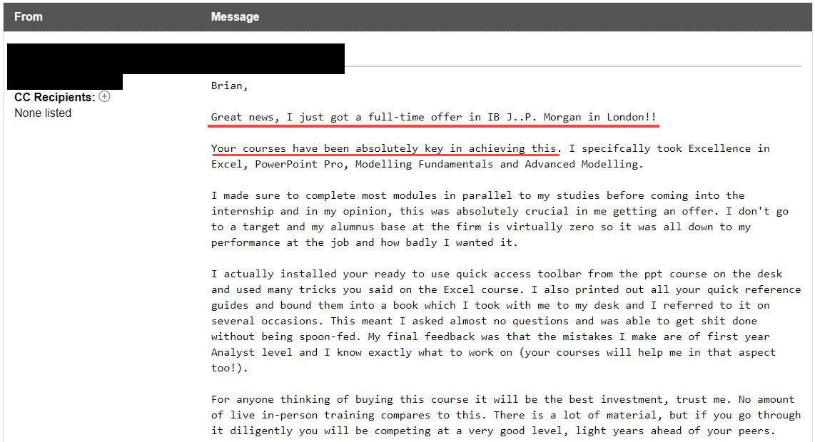 “Great news, I just got a full-time offer in IB J.P. Morgan in London!! Your courses have been absolutely key in achieving this.”