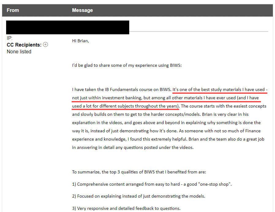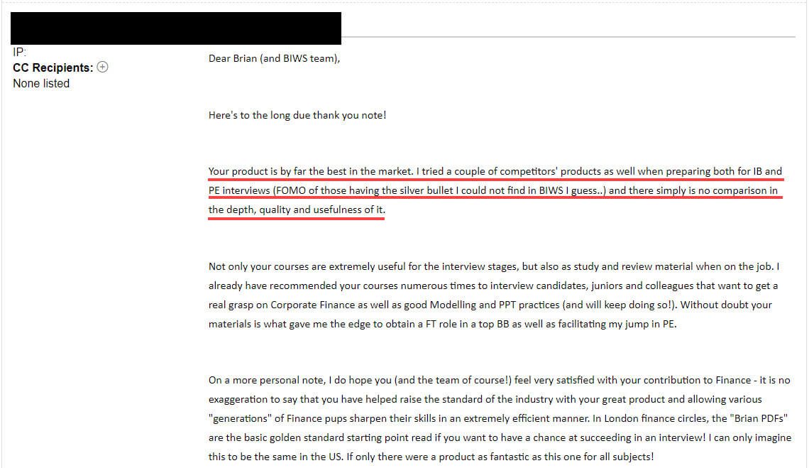 “Your product is, by far, the best in the market. I tried a couple of competitors' products as well when preparing for both IB and PE interviews (FOMO of those having the silver bullet I could not find in BIWS I guess...) and there simply is no comparison to the depth, quality, and usefulness of it.”