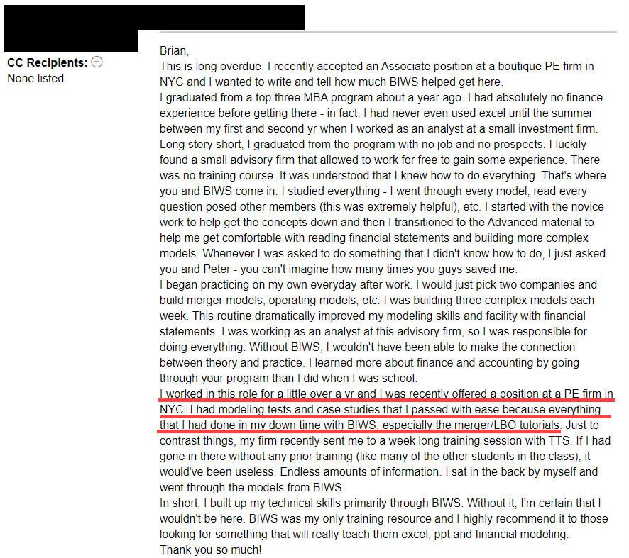 “I worked in this role for a little over a year and I was recently offered a position at a PE firm in NYC. I had modeling tests and case studies that I passed with ease because [of] everything that I had done in my down time with BIWS, especially the merger/LBO tutorials.”
