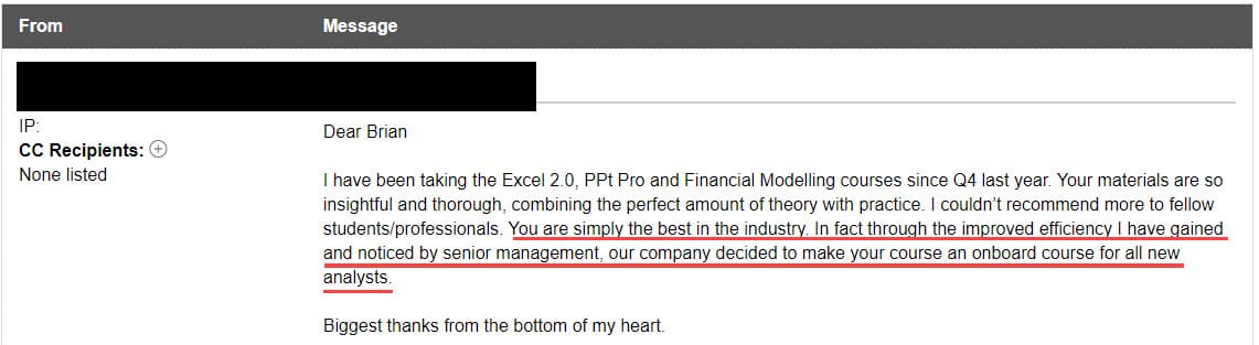 "You are simply the best in the industry. In fact, through the improved efficiency I have gained and noticed by senior management, our company decided to make your course an onboard course for all new analysts."