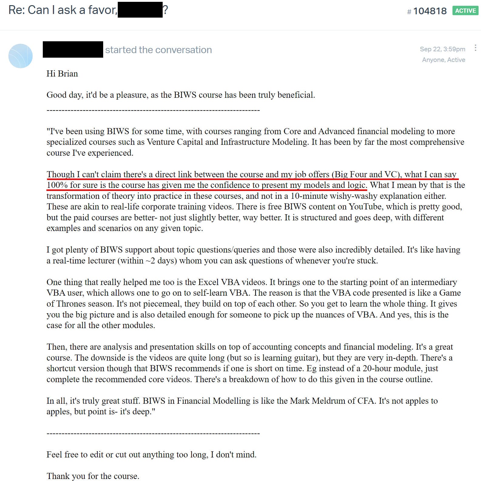 "Though I can't claim there's a direct link between the course and my job offers (Big Four and VC), what I can say 100% for sure is the course has given me the confidence to present my models and logic."