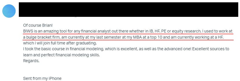 "BIWS is an amazing tool for any financial analyst out there, whether in IB, HF, PE, or equity research. I used to work at a bulge bracket firm, am currently [in] my last semester [in] my MBA at a top 10 and am currently working at a HF."