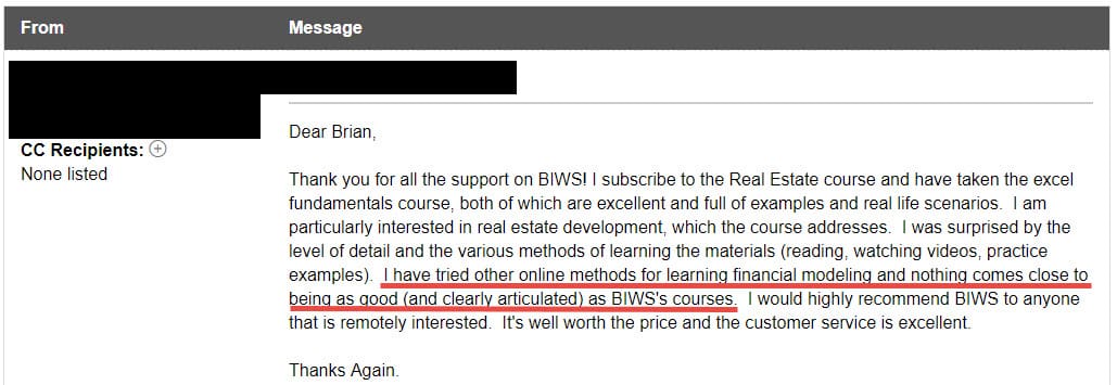 "I have tried other online methods or learning financial modeling and nothing comes close to being as good (and clearly articulated) as BIWS's courses."
