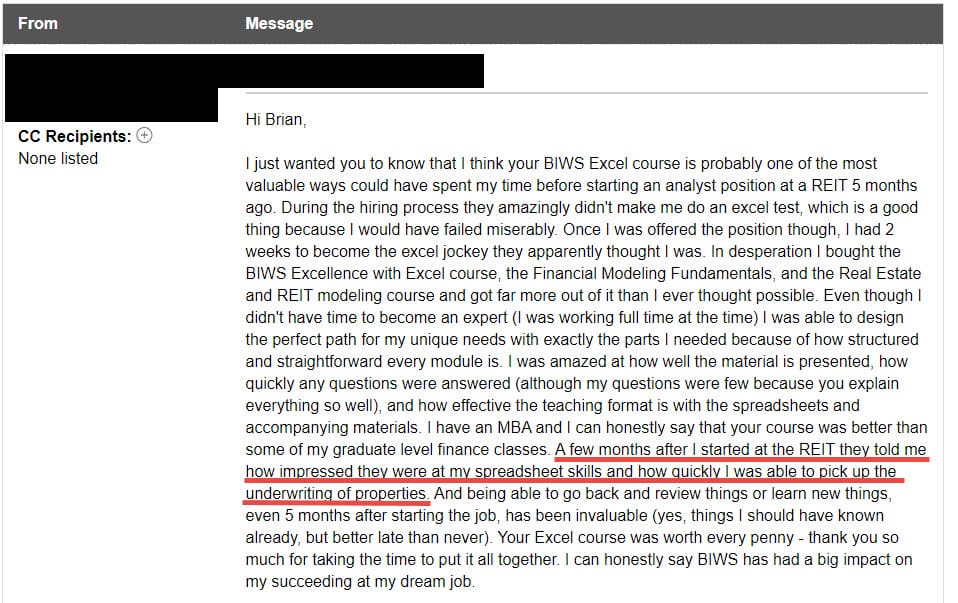 "A few months after I started at the REIT, they told me how impressed they were at my spreadsheet skills and how quickly I was able to pick up the underwriting of properties."