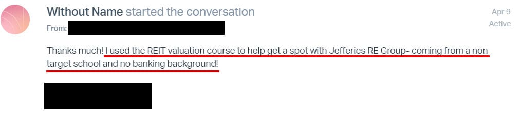 "I used the REIT valuation course to help get a spot with Jefferies RE Group - coming from a non-target school and no banking background."