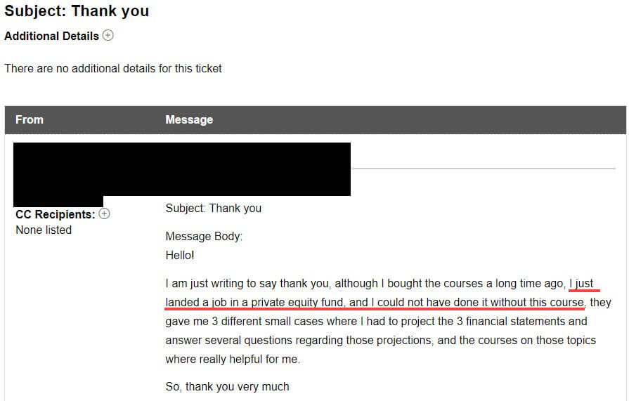 These comments are monitored and responded to by our expert support team – every one of whom has personal experience working on deals at investment banks, private equity firms, and other finance firms.