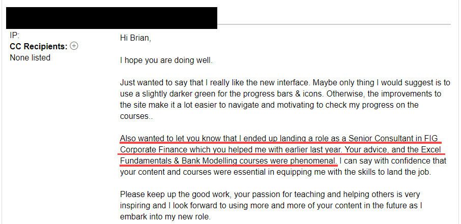 “Also wanted to let you know that I ended up landing a role as a Senior Consultant in FIG Corporate Finance, which you helped me with earlier last year. Your advice, and the Excel & Fundamentals & Bank Modelling courses were phenomenal.”