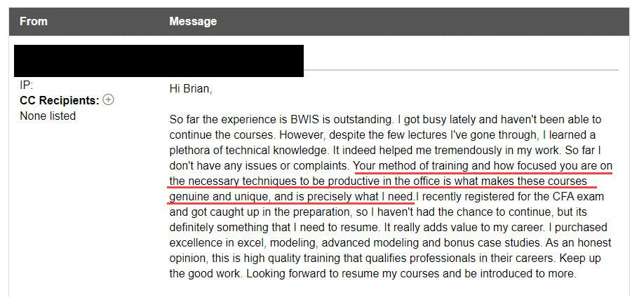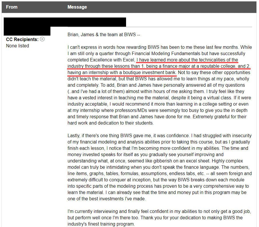 “The best thing about BIWS [that sets it] apart from [other] courses is you can ask them the most basic question and they will get back to you within a couple of hours. It could be any question - career advice / questions related to modeling / advice on [the] resume or cover letter and advice on your story.”