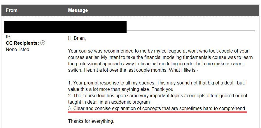 “I have learned more about the technicalities of the industry through these lessons than 1. being a finance major at a reputable college, and 2. having an internship with a boutique investment bank.”