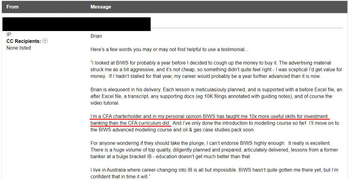 “I'm a CFA charterholder and in my personal opinion, BIWS has taught me 10x more useful skills for investment banking than the CFA curriculum did.”