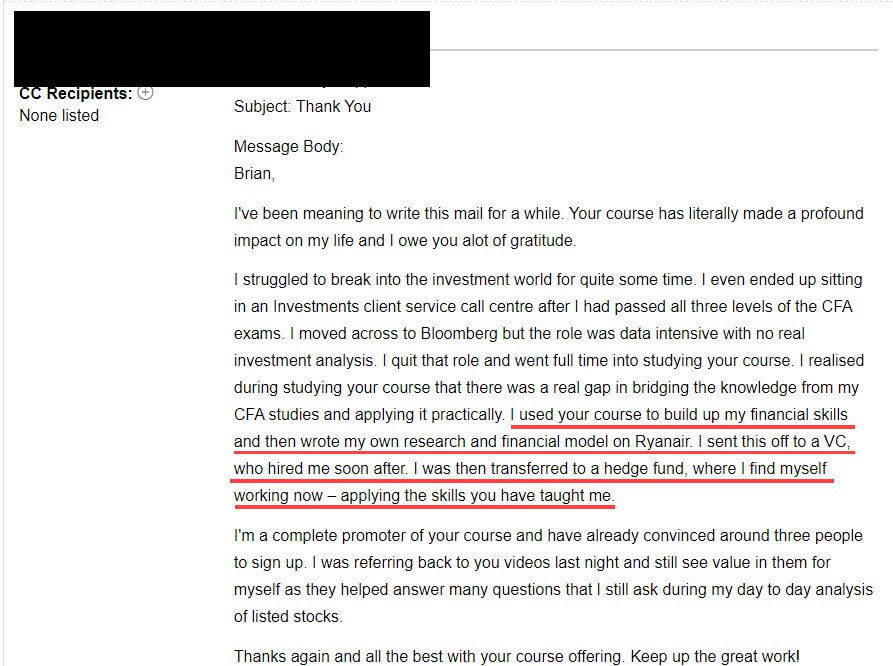 “I used your course to build up my financial skills and then wrote my own research and financial model on Ryanair. I sent this off to a VC, who hired me soon after. I was then transferred to a hedge fund, where I find myself working now - applying the skills you have taught me.”