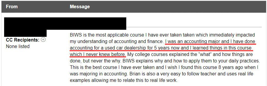 “I was an accounting major and I have done accounting for a used car dealership for 5 years now, and I learned things in this course which I never knew before.”