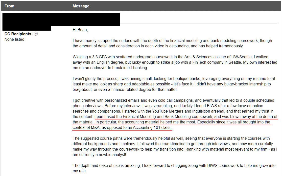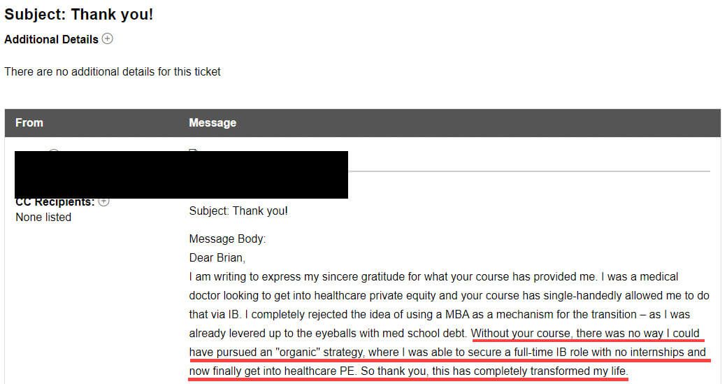 “Without your course, there was no way I could have pursued an "organic" strategy, where I was able to secure a full-time IB role with no internships and now finally get into healthcare PE. So thank you, this has completely transformed my life.”