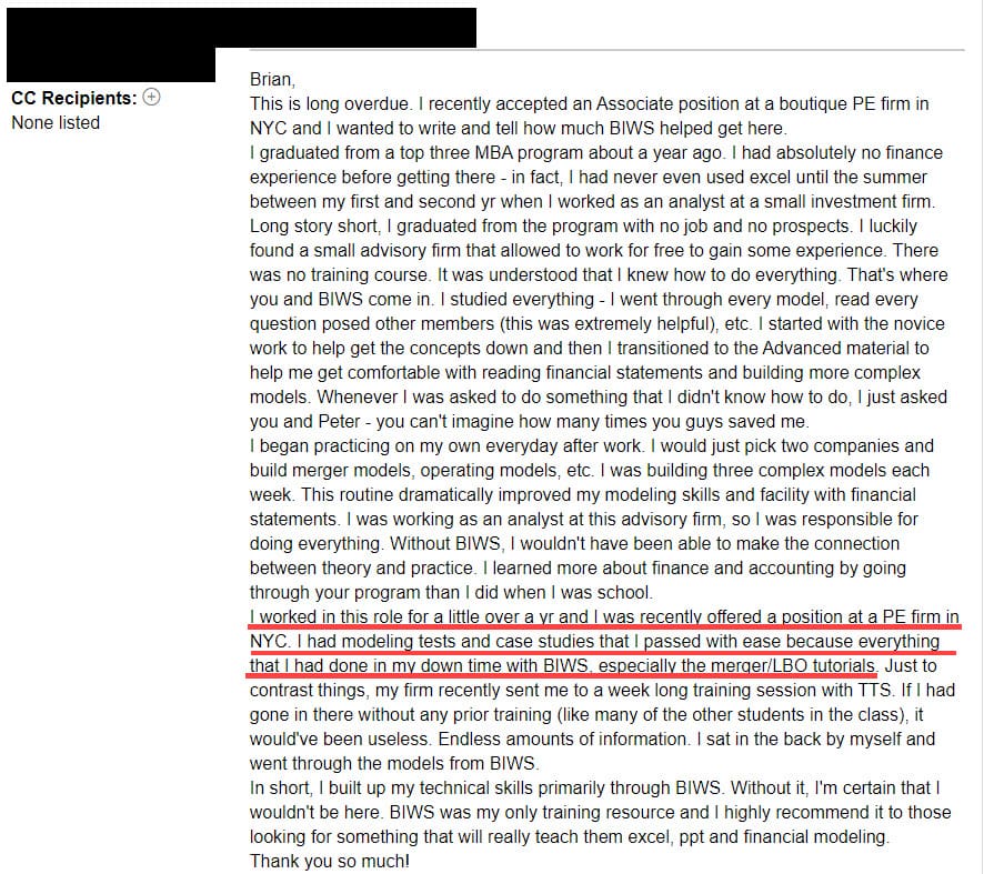 "I worked in this role for a little over a year and I was recently offered a position at a PE firm in NYC. I had modeling tests and case studies that I passed with ease because of everything I had done with BIWS in my down time, especially the merger/LBO tutorials."