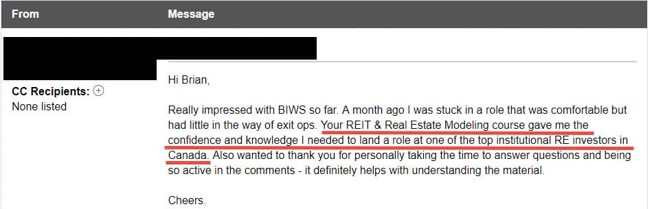 "Your [REIT] Modeling course gave me the confidence and knowledge I needed to land a role at one of the top institutional RE investors in Canada."