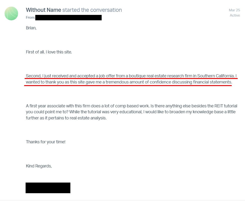 "Second, I just received and accepted a job offer from a boutique real estate research firm in Southern California. I wanted to thank you, as this site gave me a tremendous amount of confidence discussing financial statements."