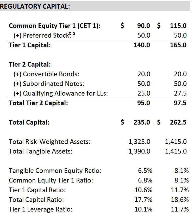 These metrics are typically divided by the bank’s Risk-Weighted Assets (RWA), and banks must maintain certain “ratios,” such as a CET 1 / RWA of 7% or greater, or a Tier 1 Capital / RWA of 8.5% or greater: